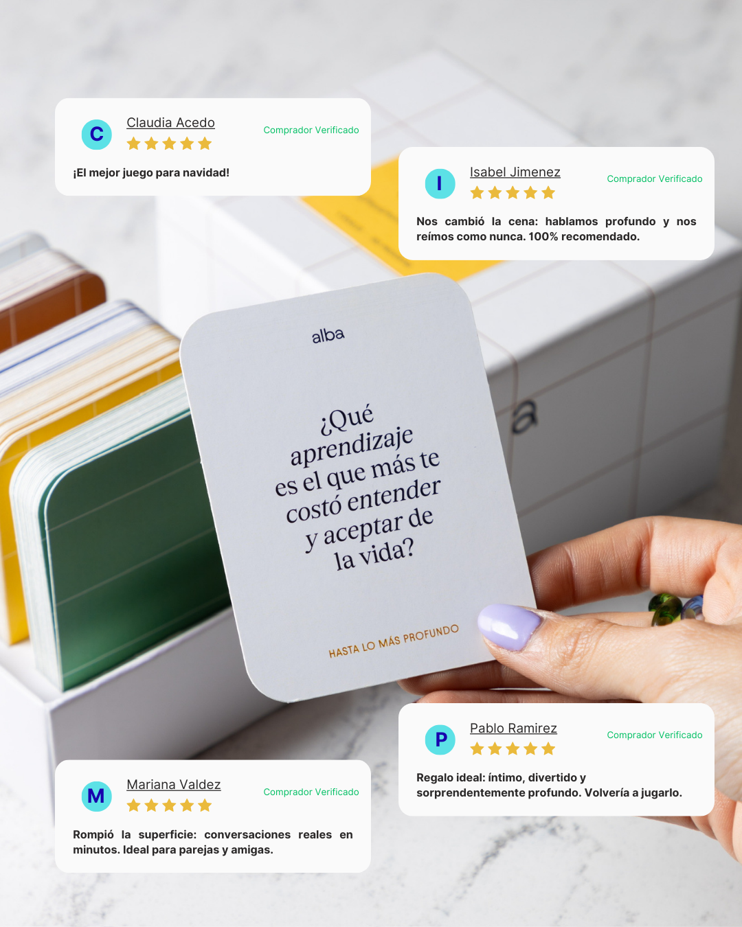 Un juego de 100 preguntas con 4 niveles de profundidad. 🫂 Diseñado para salir de lo superficial y abrir conversaciones reales, honestas y llenas de significado y conectar con tu pareja, amigos familia, etc.